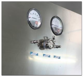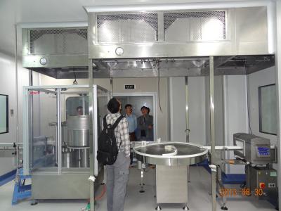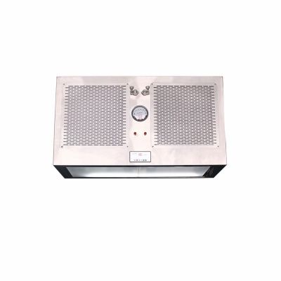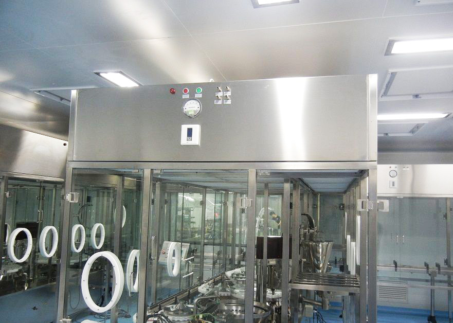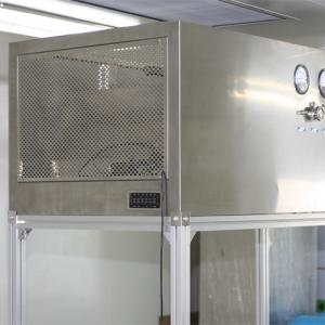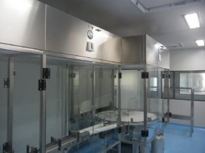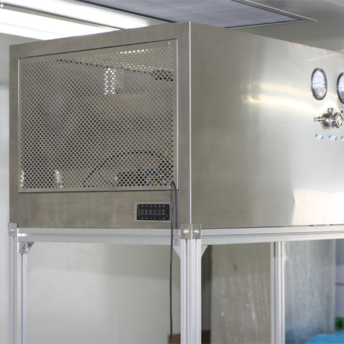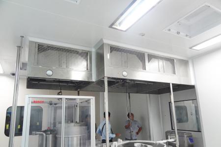 整體采用SUS304不銹鋼材料制作,利用大功率風(fēng)機(jī)或中央空調(diào)系統(tǒng)進(jìn)行送回風(fēng),溫濕度控制較為方便。過濾器采用液槽密封形式,確保無泄漏。層流罩氣流為垂直單向流,出風(fēng)面可加裝均流膜,風(fēng)速在0.36-0.55m/s,可通過煙霧測試證明單向流狀態(tài)。層流罩上安裝PAO發(fā)塵口,PAO上游采樣口,可對每臺過濾器進(jìn)行現(xiàn)場檢測。層流罩隔離裝置采用防靜電PC板或防靜電軟簾。