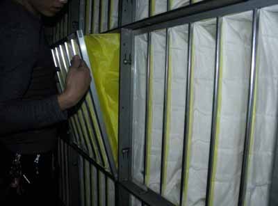工人正在安裝更換新的F8級(jí)中效袋式過濾器